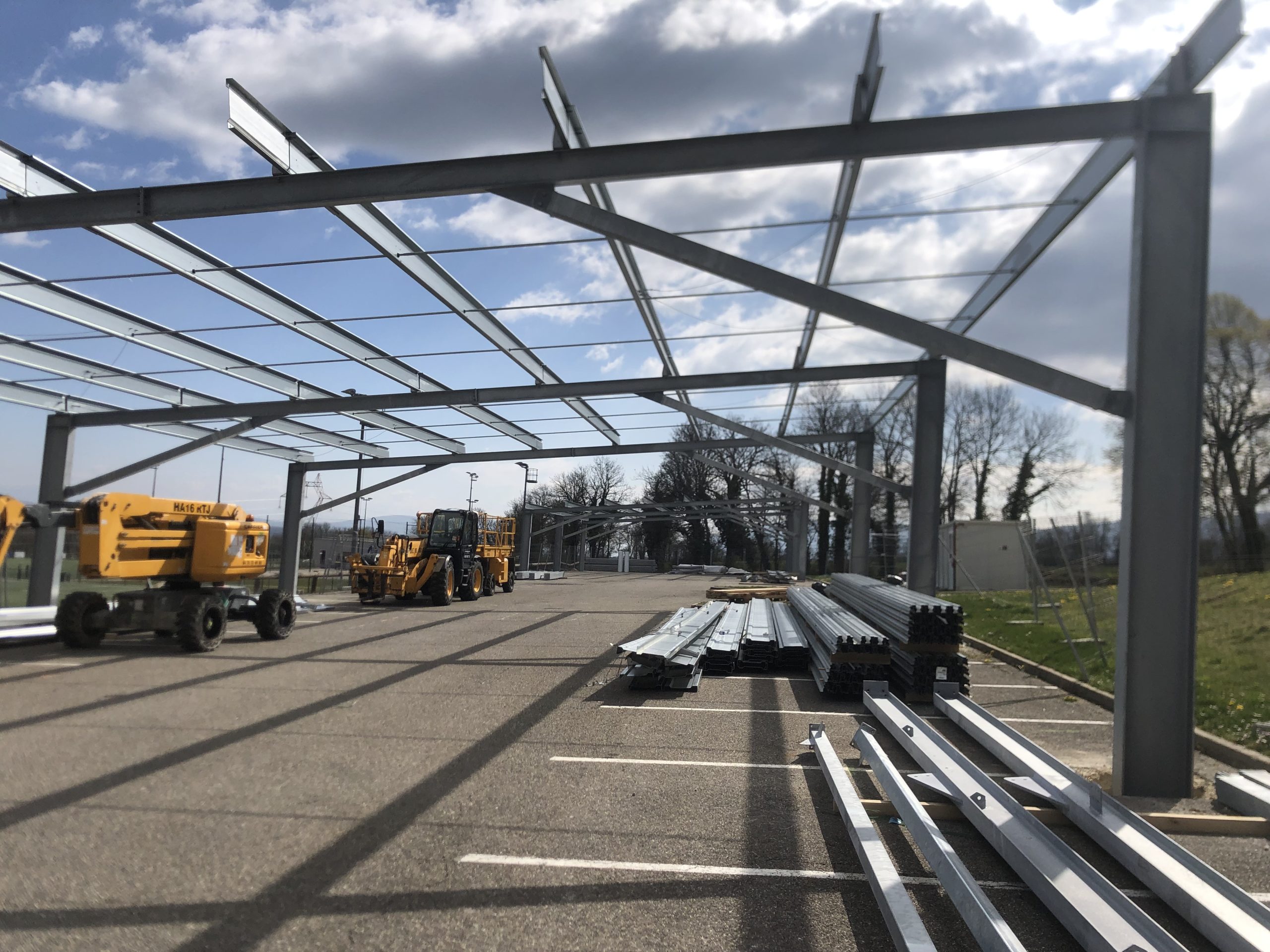 Les travaux des ombrières photovoltaïques du parking de la salle polyvalente de PORT avancement à grand pas avec le montage des structures en cours par ADIWATT. Dans les prochaines semaines suivront la pose du système d'intégration et des panneaux par ADIWATT, la réalisation des réseaux par PARUTTO, les raccordements et travaux électriques par OMEXOM.
