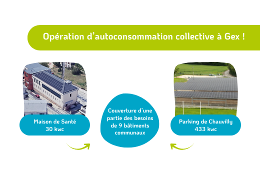 Une nouvelle opération d’autoconsommation collective (ACC) est en service depuis aujourd’hui, intégrant 2 centrales de production d’énergie photovoltaïque : 30 kWc – Installation sur la toiture de la Maison de Santé, appartenant à la Ville de GEX et 433 kWc – Ombrières du parking du stade de Chauvilly, appartenant à la SEM LÉA. 9 bâtiments communaux bénéficient de cette opération d’ACC, grâce à laquelle une partie de leurs besoins sera couverte par une électricité produite localement (jusqu’à 10 % en période hivernale).